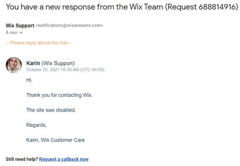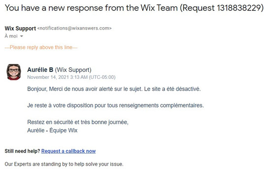 Dans un délai de 24 heures tout au plus, vous devriez recevoir une réponse de la part de Wix comme quoi le site à été désactivé. Dans mon cas, j'ai signalé de nombreux sites et c'est ce qui est arrivé à chaque fois.